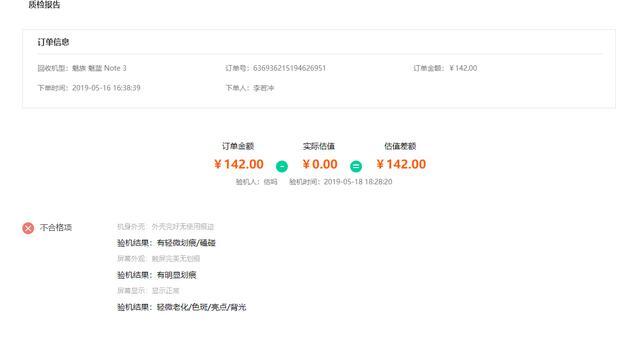 Ai回收和回收宝亲身确认后可以及时付款. 据估计,只能通过快递方式进行回收,因此整个过程要花两天多的时间. 这里需要补充的是,从收集时间到测试结束的估计收集时间为9小时. 付款后,会向我发出质量检验报告. 有三项显示不合格: