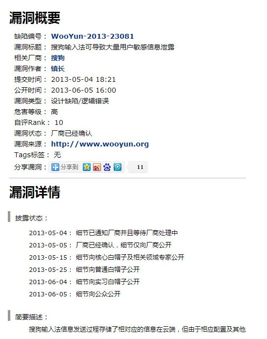 作者的搜索发现,类似于搜狗输入法侵犯用户隐私的事件已引起媒体和网民的极大关注. 2013年6月5日,著名的国内安全组织五云在搜狗输入法中检测到一个安全漏洞,并指出这将导致敏感的用户信息(如语音,照片和凭据信息)泄漏.
