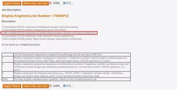工作要求明确要求“集成手机显示组件,包括设计,生产,测试,IQC等”,并且所有标记都“必须具有开发OLED的经验”.