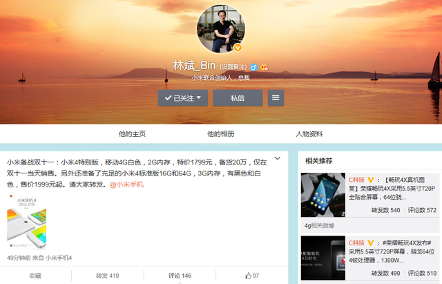 此外,从雷军个人微博的内容来看,小米手机4的特殊版本仅支持移动4G网络(TD-LTE),并向后兼容移动3G网络(TD-SCDMA)以及移动联通2G网络(GSM). 此外,小米的另一位共同创始人林斌也在他自己的微博中透露了有关小米4特别版的更多信息. 特别版的小米米4手机全都是白色,仅在双十一的小米天猫旗舰店有售,供应量为20万部.