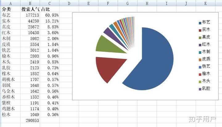 可以看出哪些沙发是由消费者关注的材料制成的,以及关注程度. 可以看出,“布”是最受欢迎的,其次是“实木和布”.
