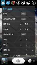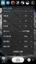 更细化的设置项中,我们还可以看到HDR/甩动切换大头贴、取景模式、白平衡、99张高速连拍、曝光调节、饱和度、亮度以及对比度等可调节功能,涵盖面非常广。elife e3