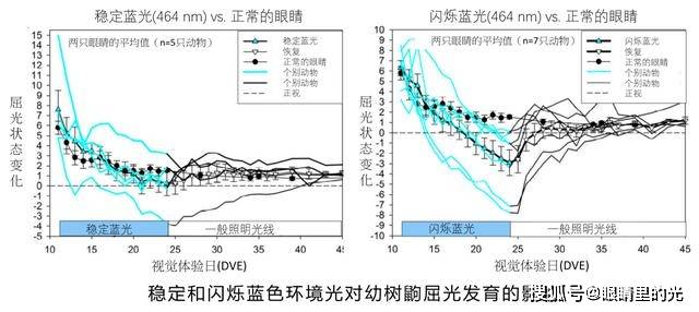 树tree研究: 树sh是与人类关系最密切的动物. [11-12] 2017年,蒂莫西(Timothy)等人研究了短波长光对眼轴发育的影响,使树sh生活在稳定的蓝光下. 在蓝光闪烁下,两种蓝光环境都可能导致树sh的眼轴暂时变长,并出现假性近视. 在停止蓝光照射之后,可以恢复假性近视,但是继续闪烁由蓝光引起的假性近视度. 增长最终将发展成为真正的近视眼. 关于蓝光对眼轴发育的影响,还有另一种说法,即短波长蓝光可以延迟眼轴的生长.