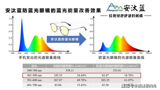 为此,我们需要一副好的防蓝光眼镜. 什么是好的?不同的防蓝光眼镜对蓝光的不同波长带有不同的主张,导致眼镜的滤光光谱曲线不同,从而影响了眼镜的防蓝光效果. 让我们以深圳Ampfie的安泰蓝色防蓝光眼镜为例. 如下图所示,他可以将电子产品释放的高强度蓝光衰减65%,并且蓝光能量实际上减少了53%,从而确保了有效的防蓝光. 同时手机闪蓝光,蓝光不会影响其他光谱.