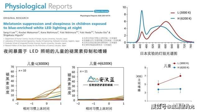 褪黑激素是一种引起嗜睡的重要神经激素. 刺激蓝光照射会导致褪黑激素分泌不足并引起睡眠问题. [21] Sang等人进行的真人实验. 在2018年,由22个健康儿童和20个成年人组在色温可调的LED吸顶灯制成的6200k和3000K照明环境下正常工作. 实验发现,在相同的光照条件下,蓝光对儿童睡眠的影响要比成年人大. 3000K彩色吸顶灯的蓝光含量低于6200K,夜间打开3000K弱蓝光吸顶灯,儿童的褪黑激素分泌更多. 睡得更好6200K的高色温和高蓝光的吸顶灯会导致儿童的困倦感增加,并且睡眠良好.
