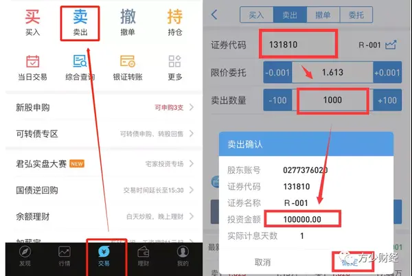如果直接使用国债逆回购代码操作,则可以直接在交易界面上进行“卖出”交易,这与以前的股票交易不同.