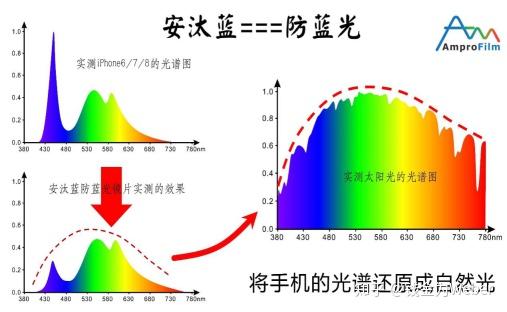 Antilan的防蓝光眼镜主张将电子屏幕的蓝光高度还原为自然光. 目前研发的防蓝光镜片可以将手机和电脑的峰值蓝光降低65%,并将蓝眼伤害能量降低53%. 镜头的防蓝光效果如下所示.