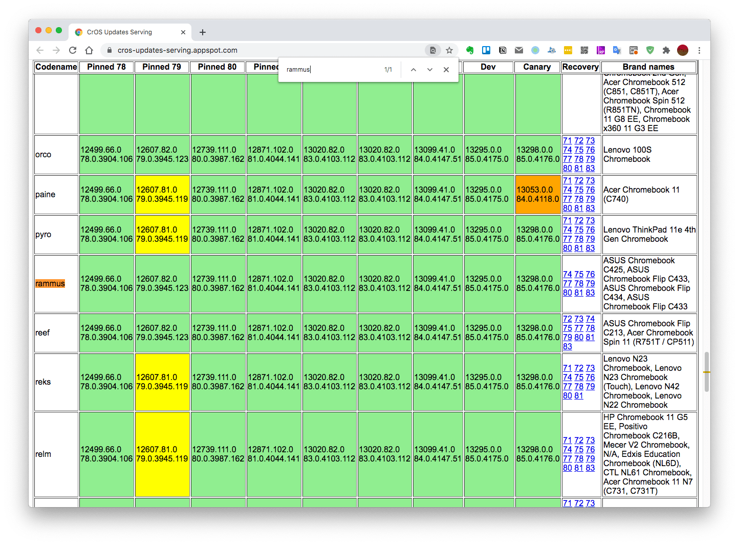 接下来,我们准备Google的官方Chrome OS恢复映像,打开此离线映像收集网站,然后使用快捷键CTRL + F搜索关键字“ rammus”,然后在“恢复”栏中单击“ 83”. 相应的表行下载恢复映像.