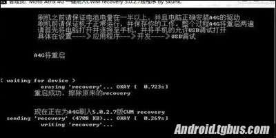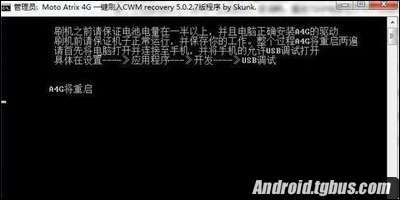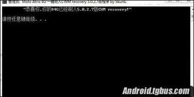 4、整个刷入过程中手机会重启两次,完成后,会提示你“恭喜你,你的A4G已经刷入5.0.2.7版CWM recovery”。