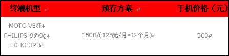 方案分析:此次方案中,广大消费者除预存1500元的话费外,还需要支付500元的购机费用,而在几款备选机型中,摩托罗拉V3、LG KG328、索爱K510C都上市较早,从整体来看没有太多亮点可言,实际零售价仅在千元左右,而预存话费+购机费却将近2000元,所以广大消费者最好还是仔细考虑一下。