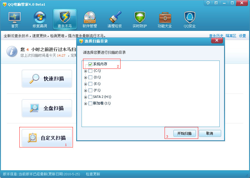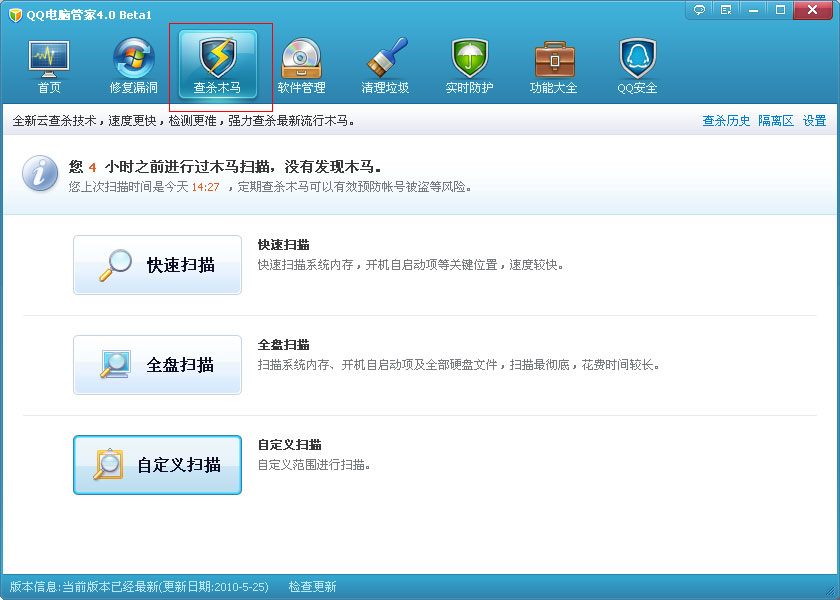 计算机管理器为您提供三种扫描方法: 快速扫描,完全扫描和自定义扫描. 您需要单击计算机管理器的“扫描并杀死木马”选项卡,然后单击“扫描”按钮以根据所需的扫描方法开始扫描并杀死木马.