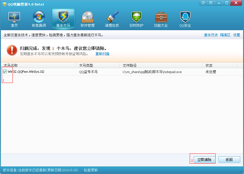 计算机管家严格控制木马的检测,并使用误报率极低的云检测和查杀技术来确保扫描结果必须最准确. 并且为了安全起见,计算机管理器默认采用可恢复的隔离方法删除木马. 如果发现已删除的木马是正常文件,则还可以通过隔离区将其还原.