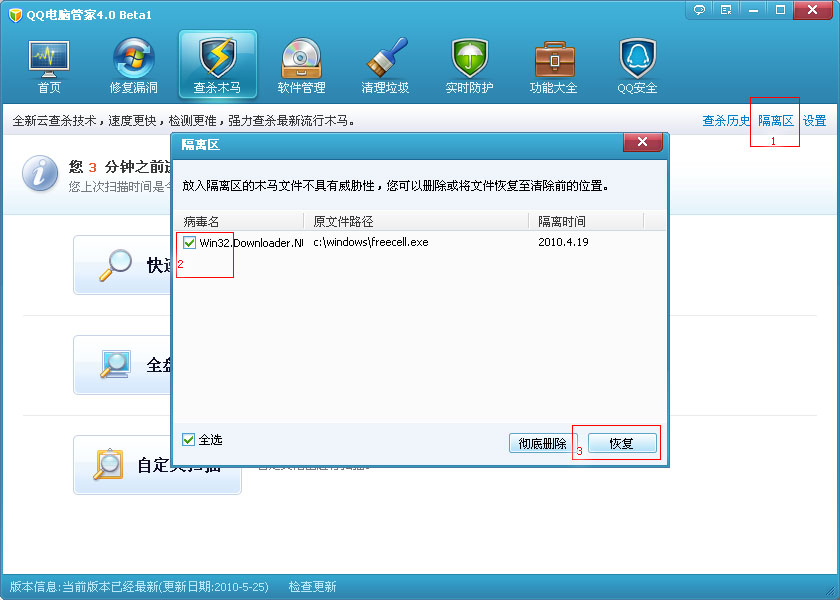 您可以单击反木马选项卡右上角的“隔离区”,在列表中选择要还原的文件,然后单击“还原”按钮以轻松还原意外删除的文件.