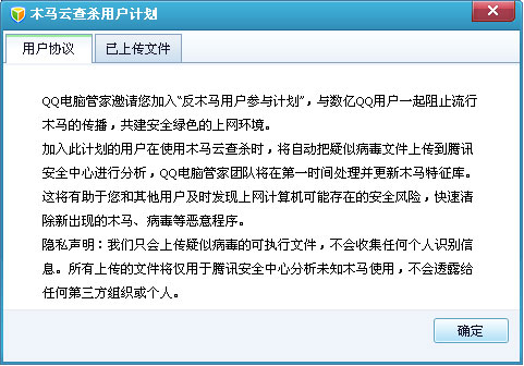 计算机管理器郑重承诺,我们将仅收集怀疑带有病毒木马的程序文件,不扫描任何不相关的文件,并且不收集任何个人身份信息. 所有上传的文件将仅由腾讯安全中心用于分析未知木马,并且不会透露给任何第三方组织.