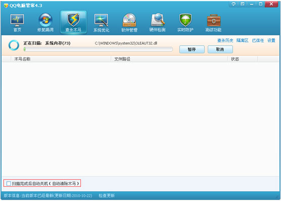 当使用Trojan Anti-Virus的“完全扫描”或“自定义扫描”时,选项“扫描后自动关闭”将出现在扫描界面的左下角. 您只需要检查此选项,然后选择计算机管理器即可. Trojan扫描完成后,发现的风险将自动清除,系统将自动关闭.