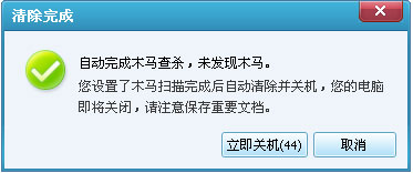 木马扫描完成后,将弹出一个自动关机提示框. 此时,计算机管理员已自动清除了发现的风险. 您可以选择立即关闭,也可以取消自动关闭.