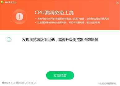 由于CPU漏洞的最大威胁是针对浏览器的恶意网页攻击,因此免疫工具将检测到浏览器并提示用户使用补丁程序升级到最新版本,从而阻止恶意网页攻击CPU漏洞的入侵渠道. 此漏洞的唯一远程攻击条目建立了坚实的安全防线.