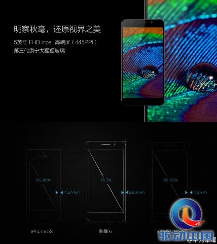 荣耀6采用JDI 5.0英寸FHD incell屏幕,像素密度高达445 PPI,搭配第三代康宁大猩猩玻璃,不惜成本只为高清视觉享受!为了让这块屏幕更加符合视觉需求,荣耀6的边框被压缩至2.86mm,达到75.7%超高屏占比,机身极致紧凑!