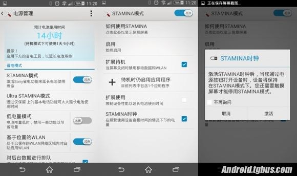 STAMINI模式可以说是索尼Xperia系列续航成绩一直表现不错的大功臣,这会在Xperia Z3上也是一大亮点。其中除了原有的STAMINI模式外,还新增了一个Ultra STAMINI模式,在下文中介绍。细节功能上,除了原有的基于位置的WLAN、后台数据排队之外,还新增了一个小功能“STAMINI时钟”,其实就是满足目前手机当手表的情况下的细节优化。