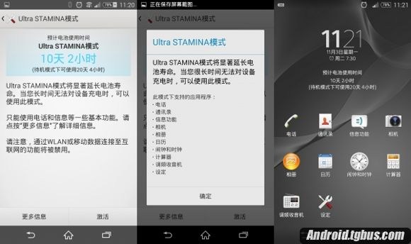 Ultra STAMINI模式其实就是STAMINI模式极致版,在提供一定功能的情况下,能显著提升使用时间,并且在说明中也表示了该模式用于长时间无法充电的情况下使用。在Ultra STAMINI模式下,Xperia Z3仅仅提供基本功能,娱乐方面仅剩下相机、相册了。此外,在Ultra STAMINI模式下,Xperia Z3最长可待机30天,使用时间也达到了10天。(一秒变功能机)