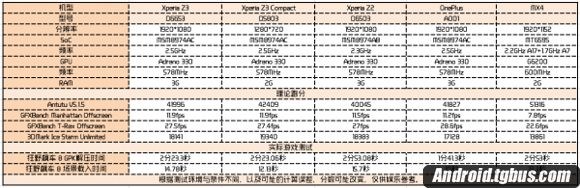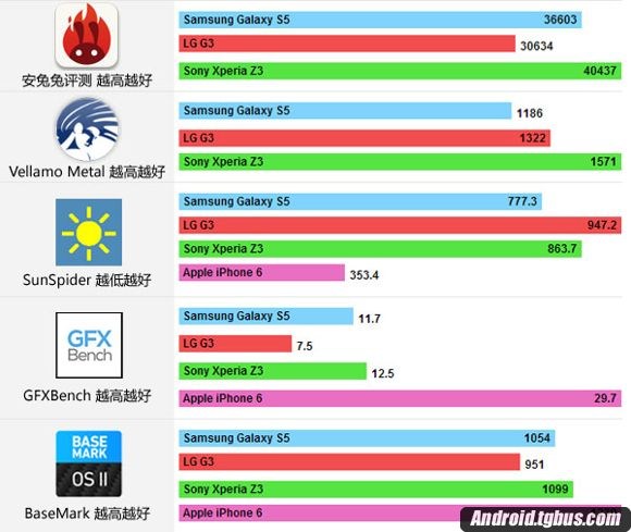 下面这张图给大家展示的是索尼Z3用各个跑分软件测试的成绩与各个旗舰手机的对比。