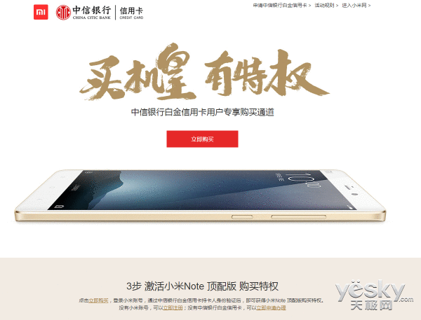 据悉,小米官网mi.com将为中信白金以上持卡用户长期开设优先购买通道,通过身份验证的白金卡持卡用户,无需排队预约,即可直接购买小米旗舰产品,首批产品为安卓机皇小米Note顶配版。网上买小米手机怎么预约