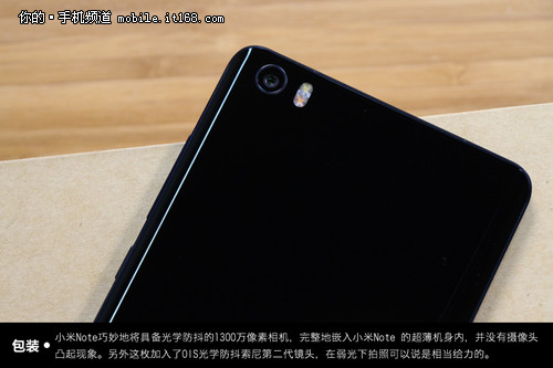 正面顶部,小米Note采用了一颗1300万像素OIS光学防抖索尼堆栈式二代相机,并且也配备了飞利浦双光源闪光灯。在硬件参数方面,小米Note的这颗和iPhone6 Plus没有任何差别,但值得一提的是iPhone6 Plus采用的凸起设计是小米不能容忍的。发布会上雷军表示小米工程师通过和相机模组生厂商的合作,为相机研发出了一种新的结构,并且申请了专利,正是这项技术,让小米Note的能够和背后保持水平。