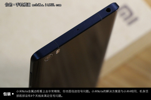 机身边框方面,此次小米Note没有延续之前小米4采用的不锈钢作为边框,而是采用了一整块航空铝进行切割、CNC加工成型,是目前一种比较成熟的边框材质和工艺。机身顶部配备了3.5mm耳机插孔、降噪mic,并且用注塑的方式安放了两条天线溢出口。值得一提的是,在3.5mm耳机插口上,小米Note也采用了注塑的方式安放了绝缘环,虽然绝缘环是3.5mm耳机插口的标配,但现在已经被越来越多的厂商忽略。