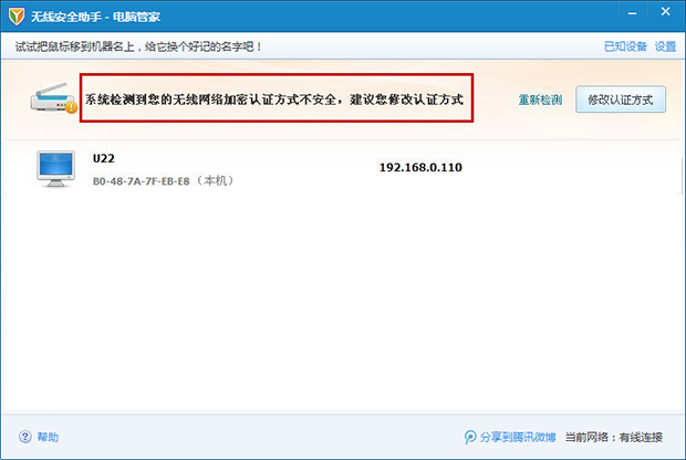 及时提醒用户无线网的安全风险,强化密码安全,令蹭网者无机可乘。