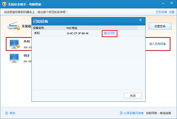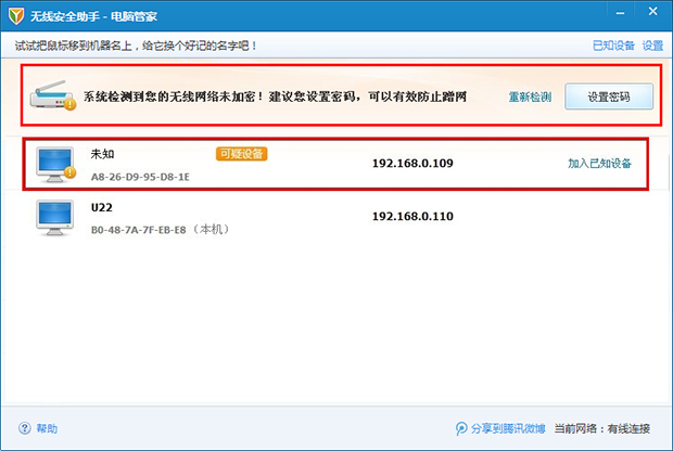 无线安全助手可以助您检测所有使用网络的设备,轻松找出可疑的蹭网设备。