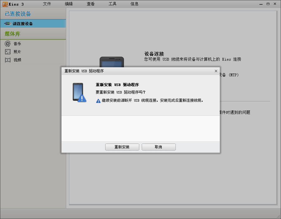 2、使用Kies中的【工具】---【重装设备驱动程序】来进行驱动的安装: