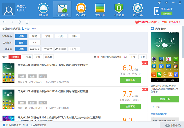 选择华为A199的刷机包或者是点击刷机大师里面的ROM基地,然后在左边点击热门品牌,搜索华为A199,点击进去就可以见到华为A199的ROM包。华为a199刷机