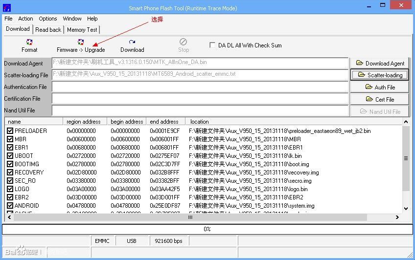 2、我们选择右边第二个按钮,选择刷机包内的【MT6589_Android_scatter_emmc.txt】文件,选择好以后其他全部默认无需修改。金立gn708w