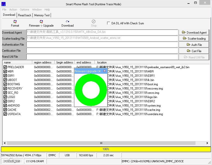 4、软件刷机完成后出现绿色圆圈。第一次开机较慢,请耐心等待!