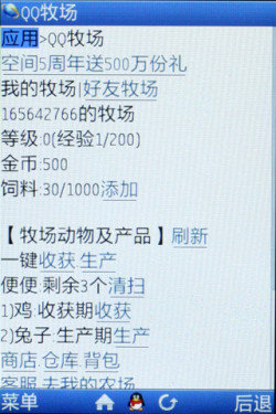 除了QQ本身之外,步步高互联音乐手机i710还内置了功能全面的QQ浏览器和QQ农场牧场(小编的QQ竟然还没有开通过QQ农场牧场,糗~),从QQ浏览器中,我们几乎可以访问所有腾讯的常用应用,非常方便,而且,如果使用QQ浏览器登陆腾讯应用,是有惊喜和特权的哦,例如QQ农场和QQ牧场的一键收获、一键除草、一键生产等等,极大的方便了手机用户的使用,使得我们不用再进行繁琐的操作。
