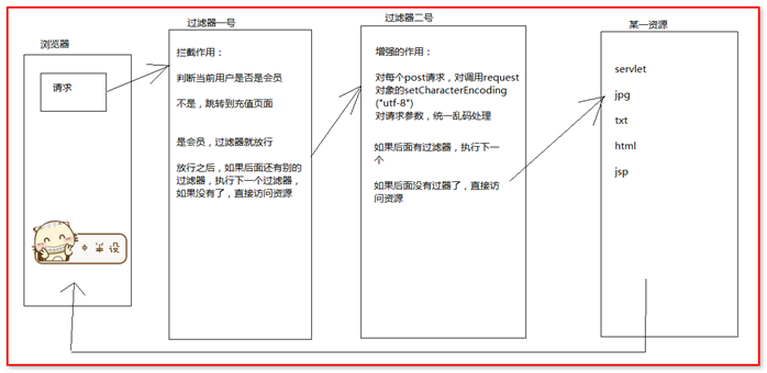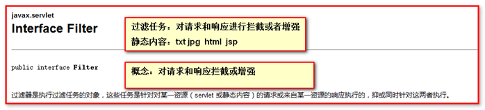 JavaWeb中的过滤器的概念: 对请求和响应进行拦截或者增强的对象,就是过滤器。