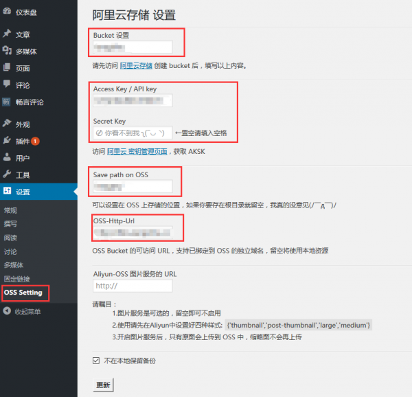 第四步,设置阿里云OSS插件,根据提示设置即可,如下图所示: