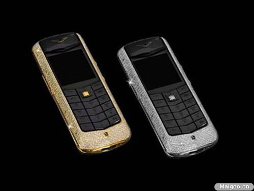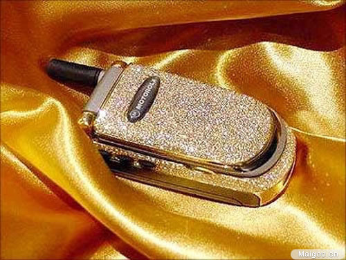 摩托罗拉V220虽是老掉牙的机型,但这款特别版本却通过镶金嵌银的方式让自己变得身价不菲。这款由奥地利Peter Aloisson公司打造的豪华手机,在机身表面上镶嵌了1200粒天然,并且还用18K金重新装饰了手机键盘,璀璨耀眼的奢华机身着实让人为之侧目。