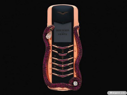 值得一提的是,这款由Vertu与法国珠宝商宝诗龙(Frédéric Boucheron)联合推出的豪华手机共有Signature Cobra和Signature Python两种型号,商家标榜要将珠宝钟表技艺与移动通信完美联姻。其中,Signature Cobra限量版在蛇身镶有439颗,眼睛则为两颗祖母绿。全球发行8台。而后者共镶嵌了48颗,纯金铺镶款则共有943颗圆形切割的,在全球发行26台。