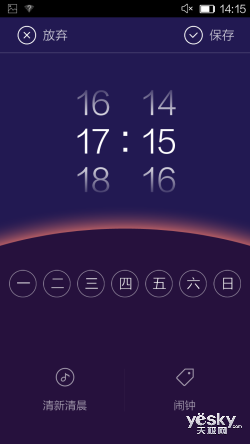 在手机的时间功能上,发现了一个非常好玩的细节。我们在设定闹钟的时候,页面效果会根据时间呈现不同的光芒,尽管只是一个小小的闹钟功能,但是体验非常不错,足以体现Amigo在细节上的精心准备。