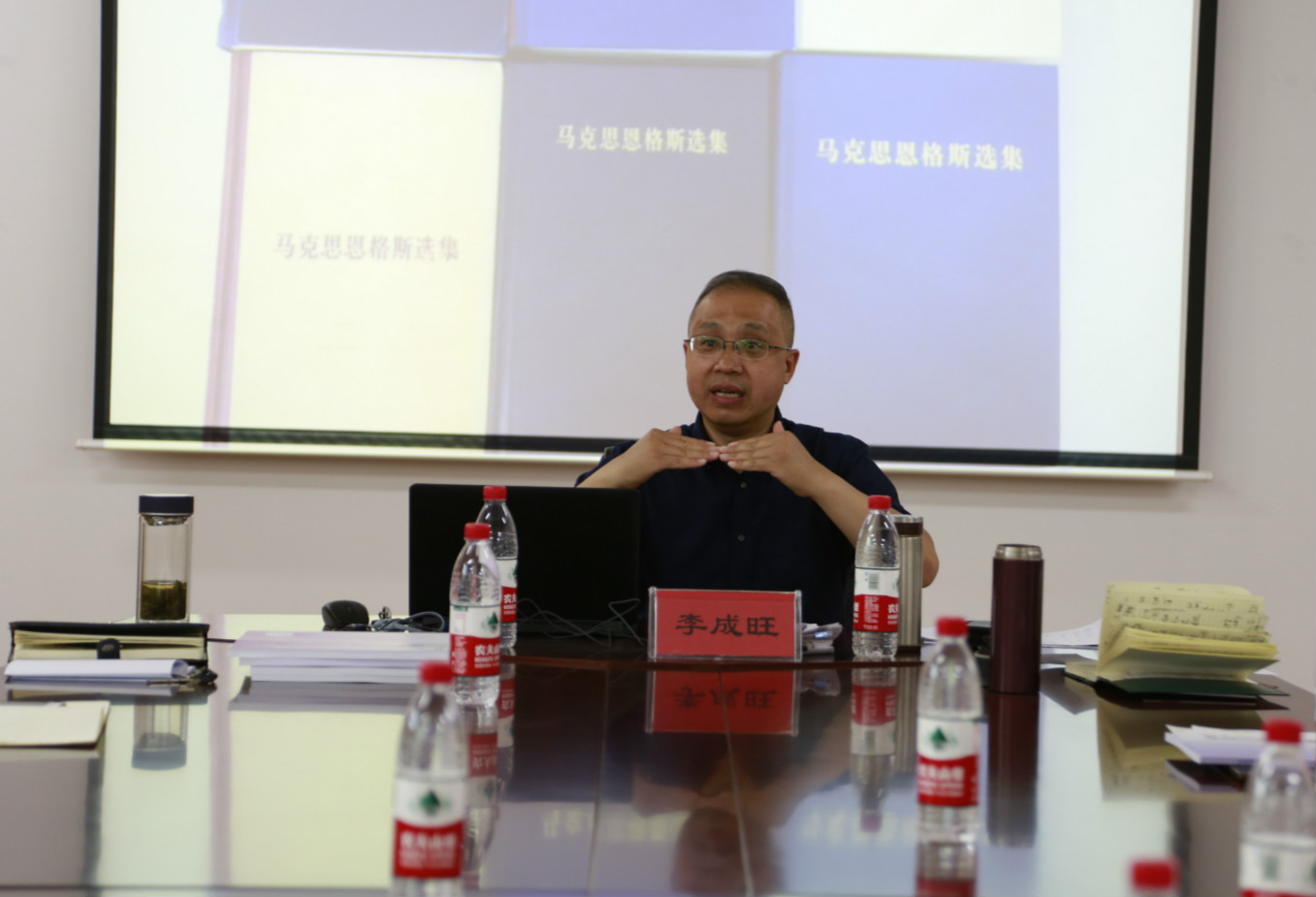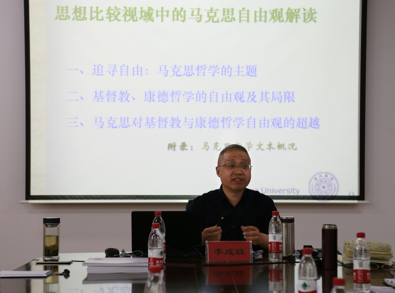 随后,李成旺老师结合自身研究《德意志意识形态》的学术历程,以“思想比较视域中的自由观解读”为题做了专题报告,指出对自由的不懈追寻和探索始终是哲学的核心主题,因此揭示哲学在自由问题思考上的科学路径,无疑就成为准确把握哲学本真精神的关键。但长期以来由于受苏联传统教科书的影响,受一种固着于庸俗实际的狭隘实践观的影响,我们对哲学的学理研究在某种程度上则被淡化了,由此导致了对本真精神不同程度的遮蔽。李成旺而如若我们能超越对哲学的种种独断论的理解,进入一个历史的和比较的视野中,那么就不难发现,哲学对自由问题的思考始终是站在西方希腊—教传统及其发展的制高点上,并在超越中呈现出自身的独特哲学智慧的。在合著的《德意志意识形态》一书中,我们可以找到这种超越的线索。在这一历史唯物主义的奠基之作中,在对青年黑格尔派进行批判的过程中,探讨了自由这一概念在西方文化史中的两种代表性理解模式,即教和康德对自由的理解,成为我们理解思想革命及其本真精神的重要路标。李成旺按照的理解,教虽然开启了自由意志的维度,但它是以启示的方式来展开对自由问题的思考,把自由理解为由上帝给予的自由意志能力以及人如何从罪恶和不义状态中解放出来,并试图通过从“人—神”关系到“人—人”关系再到“人—神”的思路来加以实现,因而不可避免地陷入“空洞的、实际上毫无实效的道德说教”;而康德哲学在对教自由观的批评中出场,把自由理解为有理性的存在者完全凭借自身的理性,为自身颁布“道德律令”并将之表象化为实际行动,但最终却公设灵魂不朽和上帝存有来保证自由的实现,又呈现出从“人—人”关系到“人—神”关系的思考逻辑。