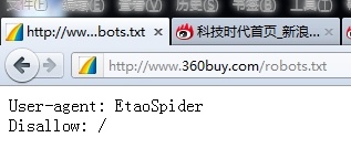 10月25日上午消息,京东商城与阿里巴巴集团旗下比价购物搜索一淘网的暗战出现最新进展,京东商城已通过技术手段在页面中加入“User-agent: EtaoSpider Disallow: /”代码,屏蔽来自一淘网的内容抓取。