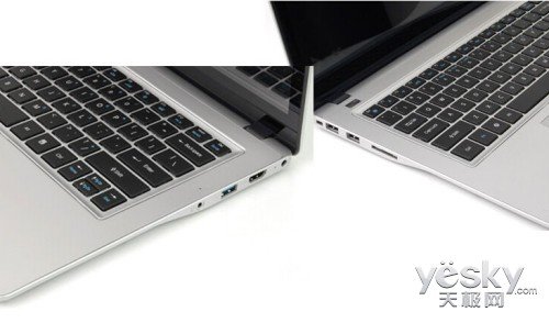 神舟飞天系列UT47D1超极本功能十分丰富,各类接口齐全:配置一个USB3.0、两个USB2.0满足高速传输的需求也能兼顾兼容性;一个音频输入输出复合端口,一个HDMI和多合一读卡器接口,满足多媒体娱乐需求;出于轻便的设计考虑,飞天UT47 D1摒弃了VGA以及RJ45接口,用户可以通过HDMI及无线网卡实现视频输出和网络连接功能。飞天UT47 D1还内置一款高清以及高敏感度麦克风,可以支持用户进行视频会议以及视频聊天。