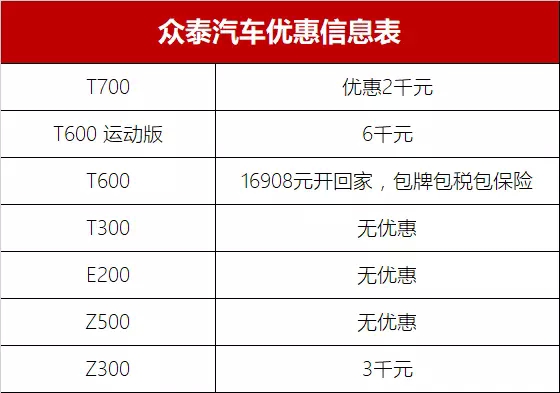 众泰神车大家都很熟悉,很意外的是年底最后一个月的优惠竟然很少,除了T600还有着16980元开回家的贷款优惠,其他车型最高优惠只有6千元,T700也只有2千元优惠。
