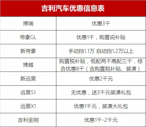 吉利旗下车型可以说款款热销,调查中吉利的4S店也是人气最旺的一家,依靠产品质量和口碑的双保险,吉利在市场终端的优惠力度一直都不算大,特别是3.0时代的精品车型,不过年前最后一个月吉利的车型在价格上也给力了,比如博越综合优惠能达到8千元,博瑞也有3千元的优惠,值得一提的是新帝豪的优惠力度达到1.1万以上,比之前要高出很多,月底前购买还能享受购置税补贴,是非常划算的。