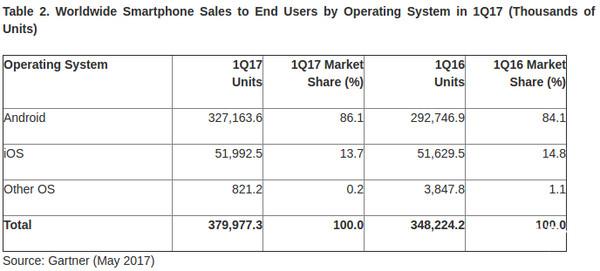 日前,市场调研机构Gartner发布了2017年第一季度智能手机追踪报告,其中数据显示iOS系统设备在该季度的出货量为5199.25万,市场份额为13.7%,而Android设备的出货量高达3.271亿,市场份额为86.1%。其他系统仅仅占据了0.2%。