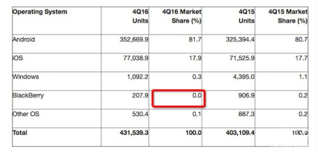 同时,根据 今年2月份Gartner 的数据显示,黑莓手机的在2016年第四季度市场份额已经降至0%。