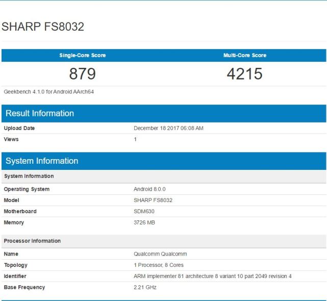 腾讯数码讯(水蓝)尽管夏普高调宣布将于明年1月推出世界第一高屏占比的新机,但在其他硬件配置方面却似乎不太给力。日前,便有一款型号为FS8032的夏普新机出现在跑分网站Geekbench的中,预装的Android 8.0系统,但仅有4GB内存和搭载骁龙630处理器,这意味着加上过去曝光的FS8018,夏普在明年初推出的中端新机全系皆为骁龙630处理器。夏普手机型号