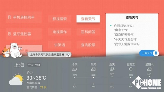 酷开系统中语音还实现各种各样的功能,你想要外出旅游,查询当地天气情况的话不需要在进入APP进行查找,只要地名+天气系统自动查询当地一周内的天气。从效率来看未来语音操控成为主流不会是天方夜谭。