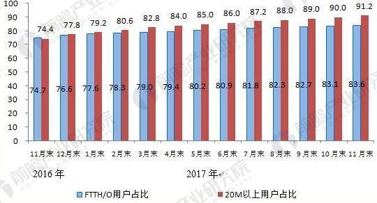 2017年11月末,三家基础电信企业的固定互联网宽带接入用户总数达3.46亿户。50Mbps及以上接入速率的固定互联网宽带接入用户总数达2.31亿户,占总用户数的66.9%。光纤接入(FTTH/O)用户总数达2.89亿户,比上年末净增6173万户,占固定互联网宽带接入用户总数的83.6%。
